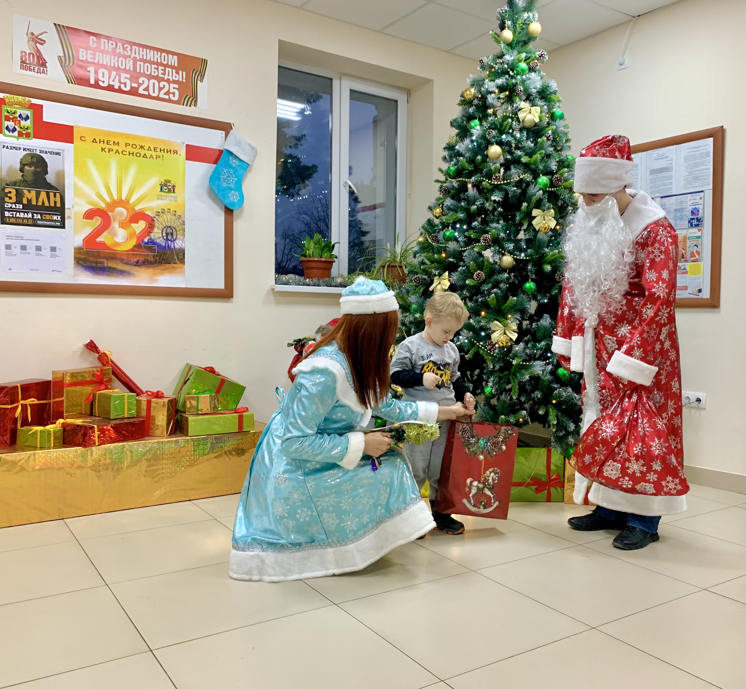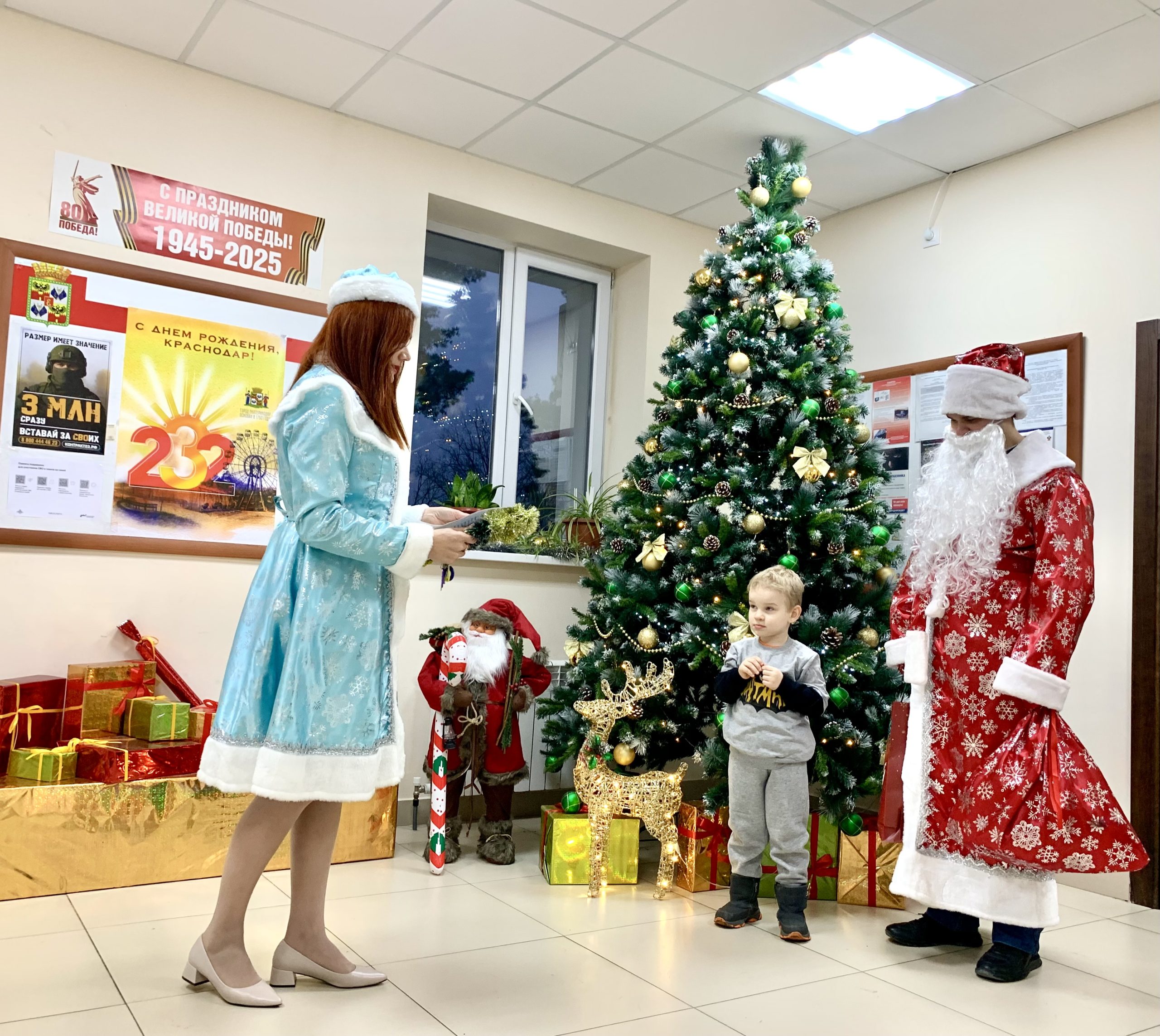 Председатель ТИК Калининская г. Краснодара Елена Долгополова в роли Снегурочки и председатель Молодежного общественного совета при ТИК Калининская г. Краснодара Клим Воронов в роли Деда Мороза в здании администрации Калининского сельского округа муниципального образования Краснодар поздравили и вручили подарки детям бойцов Петру и Татьяне, в семье членов УИК, находящихся в зоне проведения специальной военной операции.