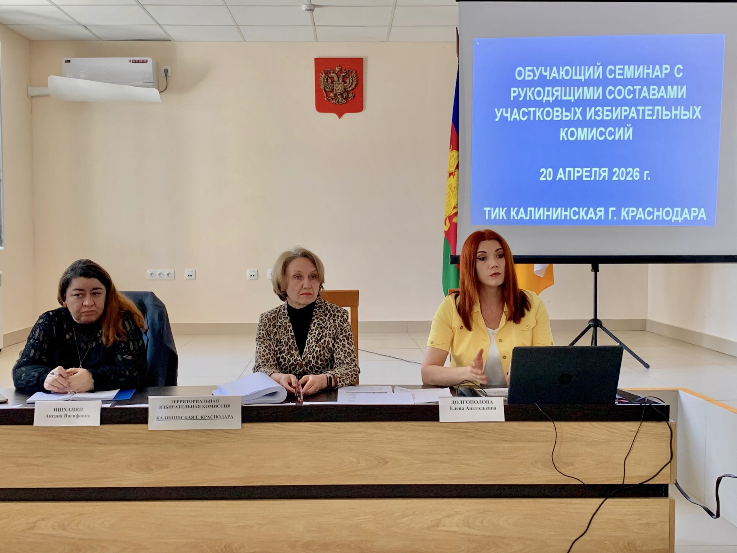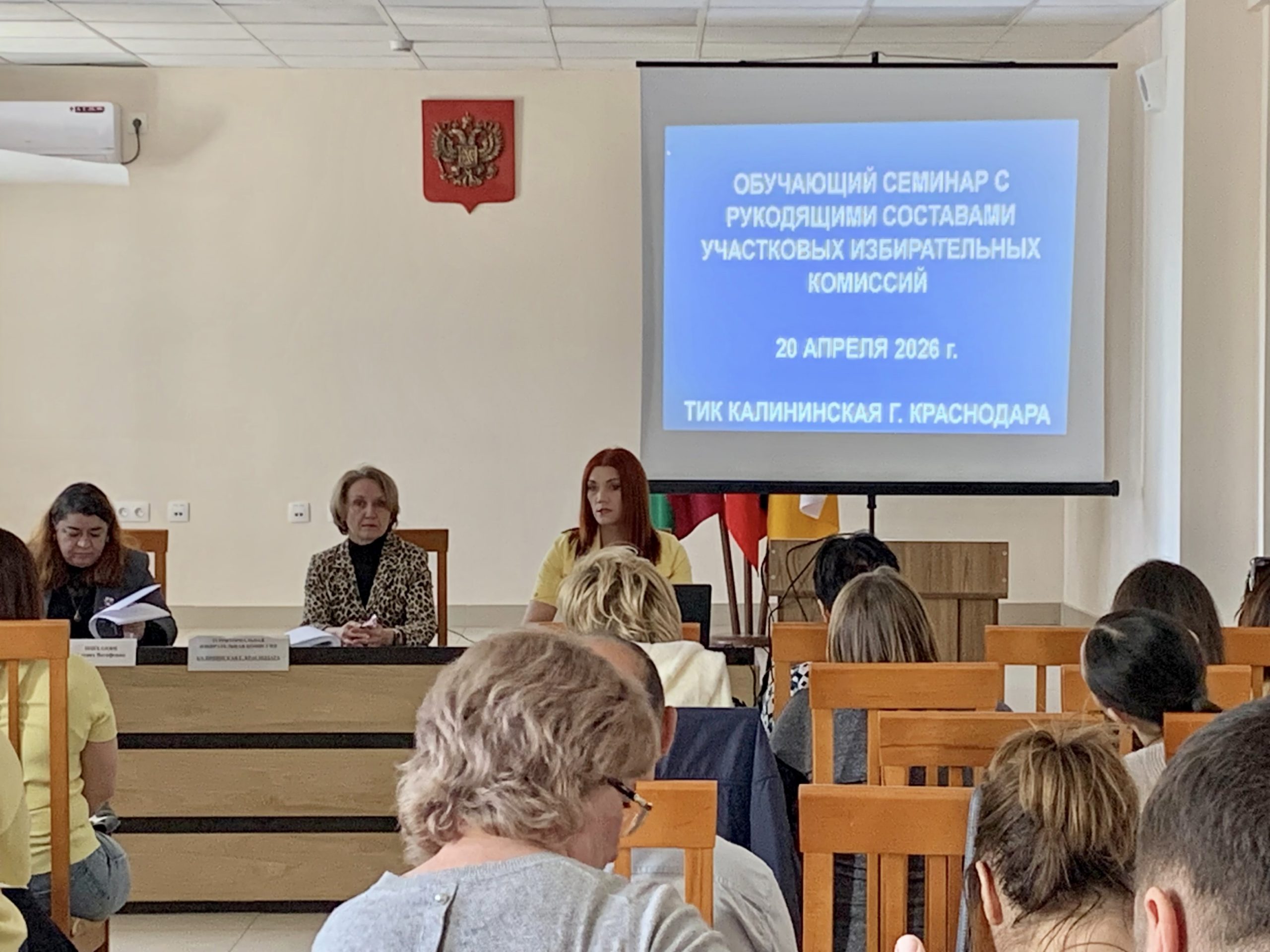 20 апреля 2026 года в зале заседаний администрации Калининского сельского округа муниципального образования город Краснодар председателем территориальной избирательной комиссии Калининская                  г. Краснодара Еленой Долгополовой, заместителем председателя ТИК Калининская г. Краснодара Аксаной Ишханян и системным администратором КСА ГАС «Выборы» ТИК Калининская г. Краснодара Ольгой Мальцевой проведен обучающий семинар  для малой группы членов руководящего состава участковых комиссий избирательных участков с № 60-01 по № 60-24.