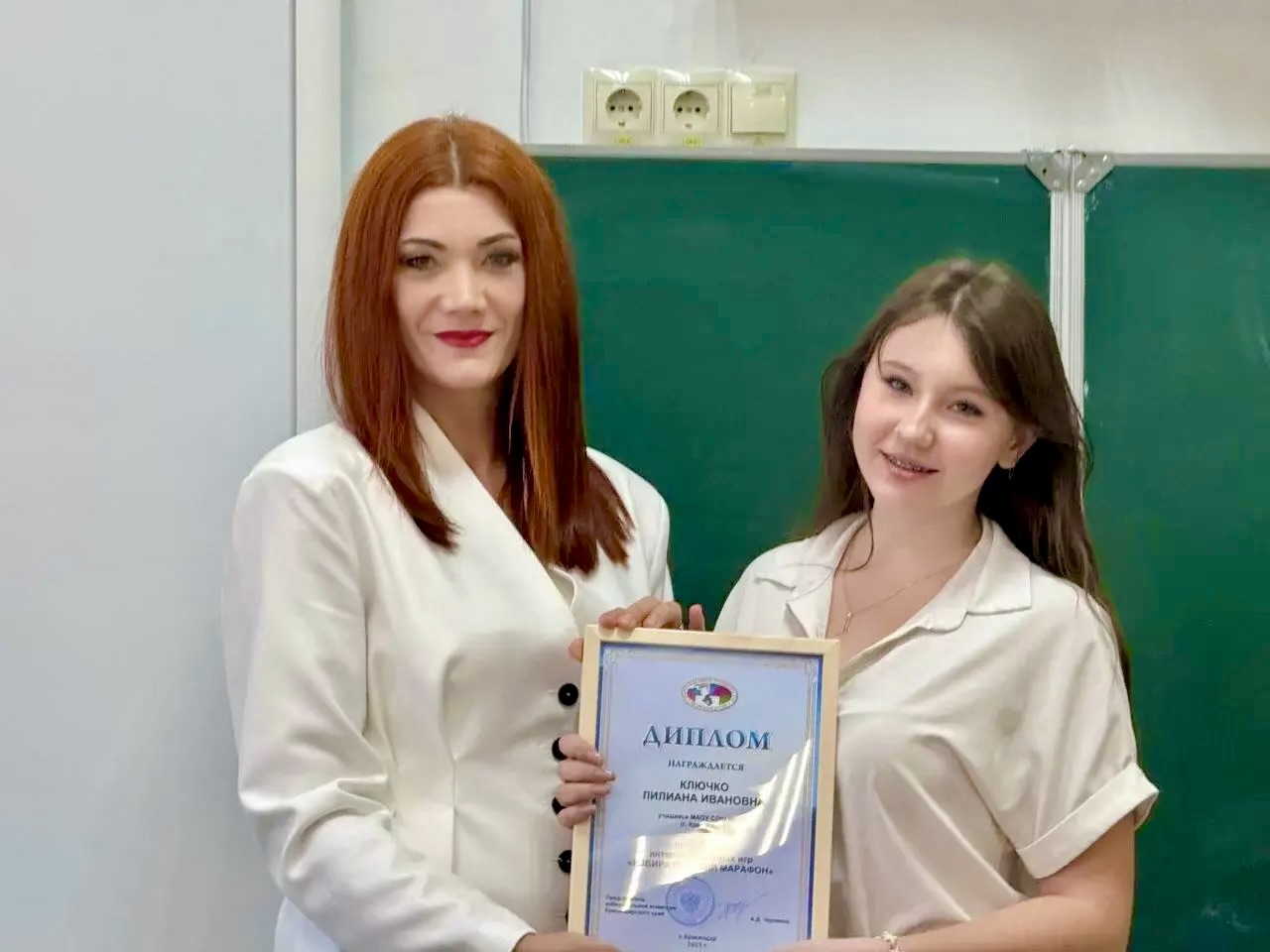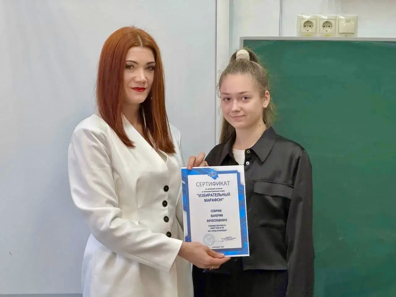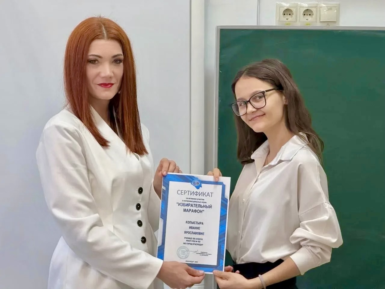17 декабря, председатель ТИК Калининская г. Краснодара Елена Долгополова приняла участие в открытом уроке с учащимися 10 «Б» класса муниципального автономного общеобразовательного учреждения муниципального образования город Краснодар средняя общеобразовательная школа № 102 имени Героя Советского Союза Георгия Бочарникова, где вручила дипломы трем победителям серии интеллектуальных игр «Избирательный марафон» (регионального этапа Всероссийской олимпиады школьников по вопросам избирательного права и избирательного процесса) Быковой Ульяне, Ключко Лилиане, Мухлаевой Полине и сертификаты за активное участие всем участникам интеллектуальных игр «Избирательный марафон». В мероприятии также приняла участие директор МАОУ МО город Краснодар СОШ № 102 Подберезина Алла Александровна.